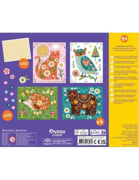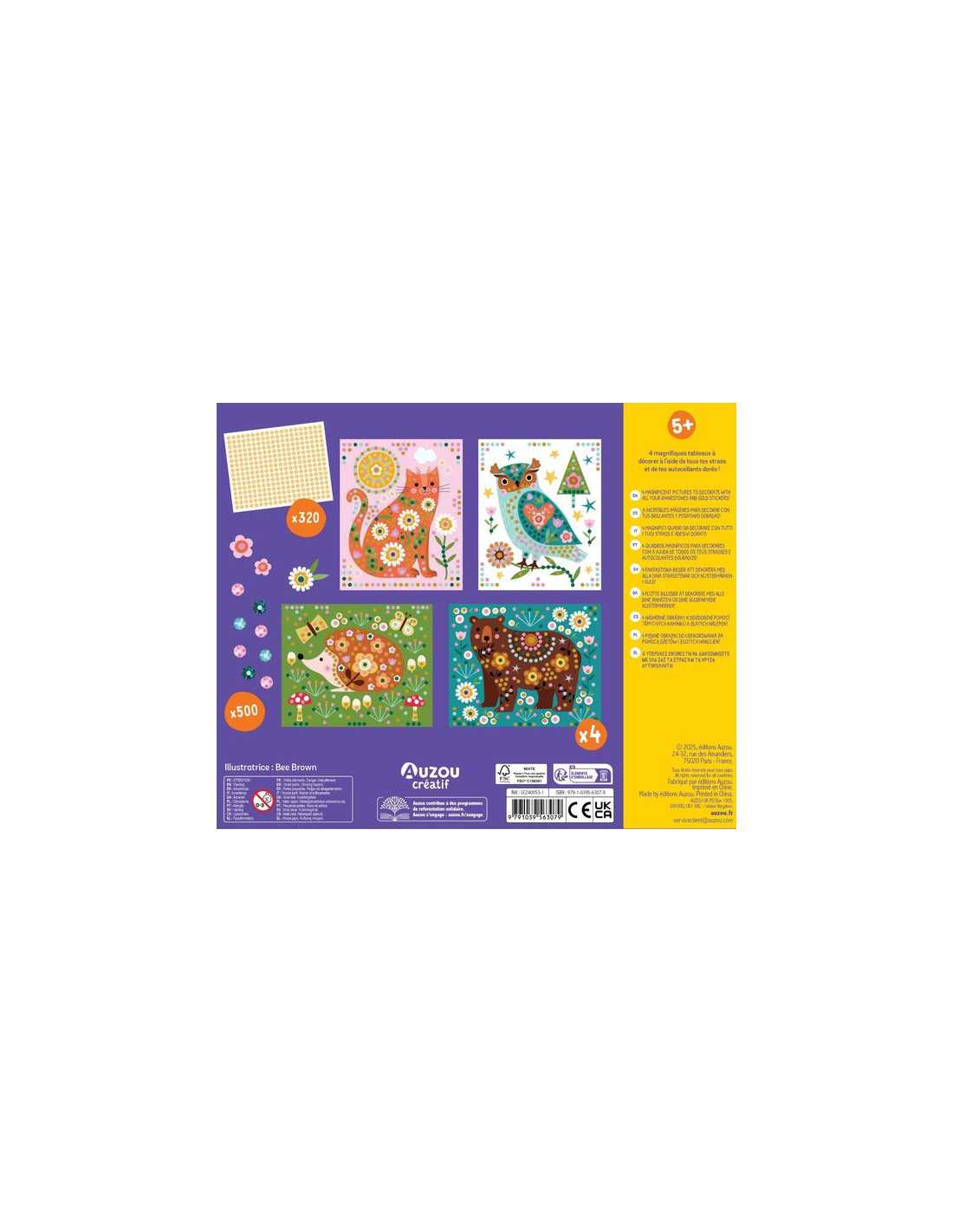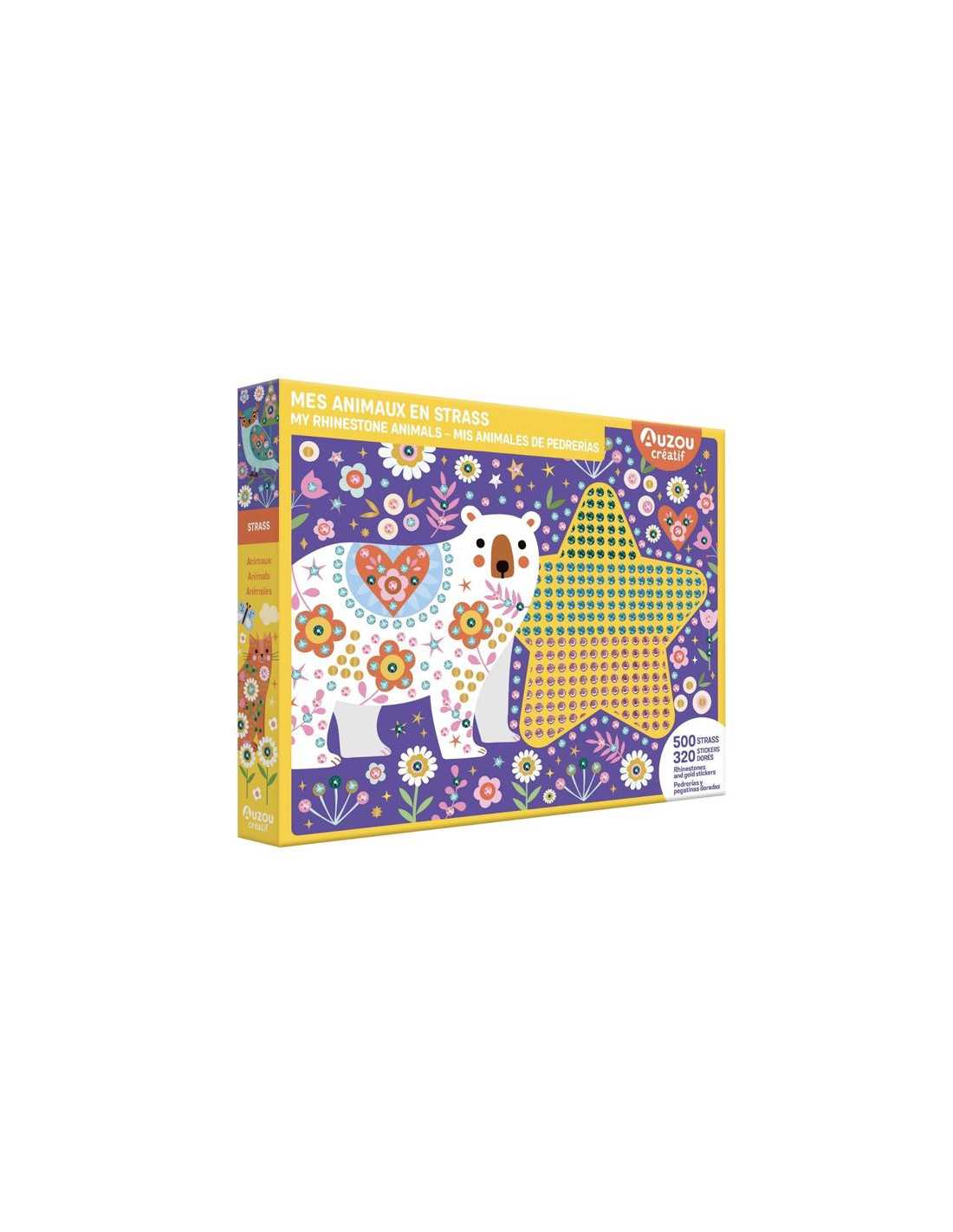 Découvrez Mes animaux en strass de Auzou, une activité créative conçue pour développer la créativité des enfants dès 5 ans en réalisant un chat, un oiseau un hérisson et un ours avec des strass.