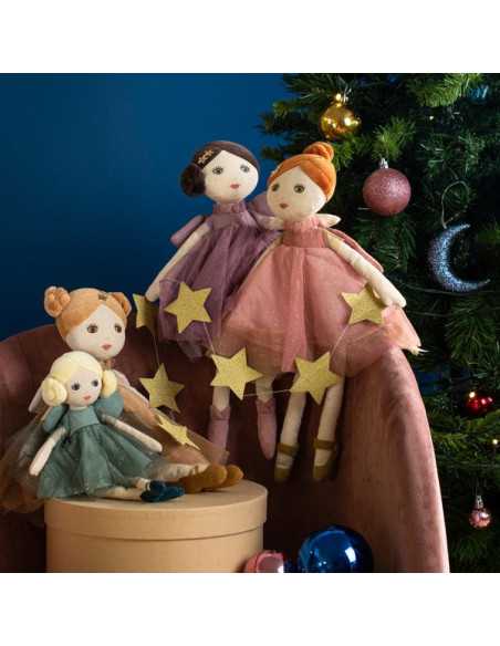 Au visage délicat brodé et sérigraphié, coiffée de deux jolis chignons de velours parés d'une jolie étoile, Mélusine la fée est vêtue d'une robe champagne avec tulle pailleté couleur or et ailes de fée dans le dos et de petits chaussons brillants.