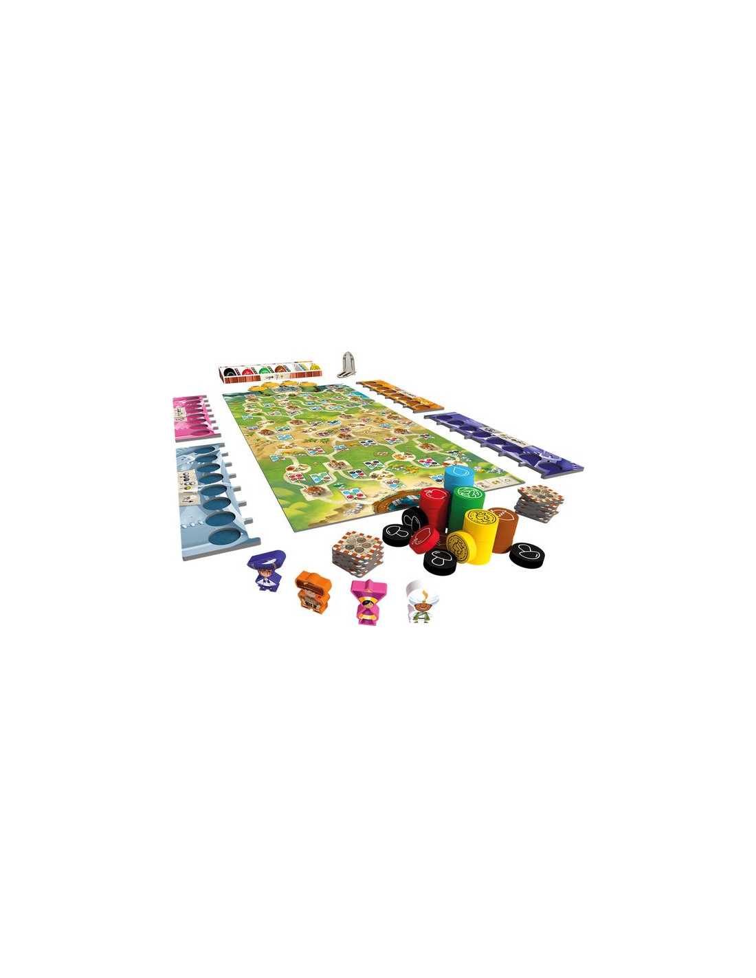 La boite de jeu contient 1 plateau en 3 parties recto-verso, 4 plateaux individuels, 4 pions Voyageur, 4 médailles de la Reine, 20 tuiles Ville (5 par couleur), 42 jetons Ressource (chou, eau, champignon, pomme, noisette, or), 1 réserve de jetons, 1 tuile Portes du palais recto verso, 8 jetons Village.