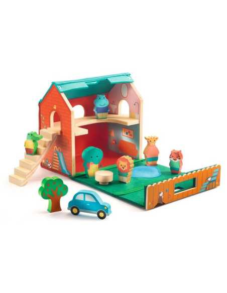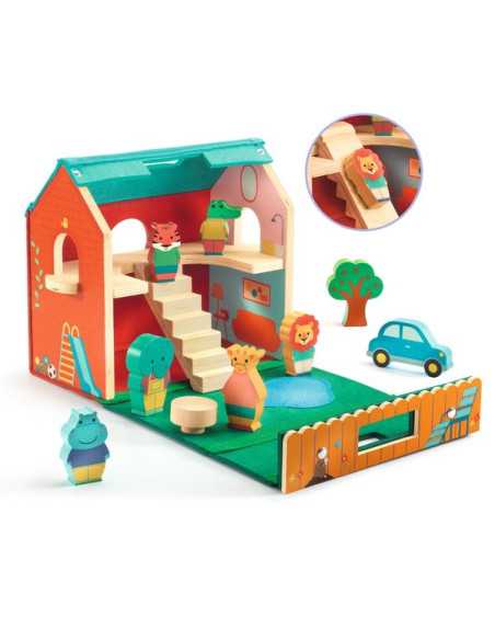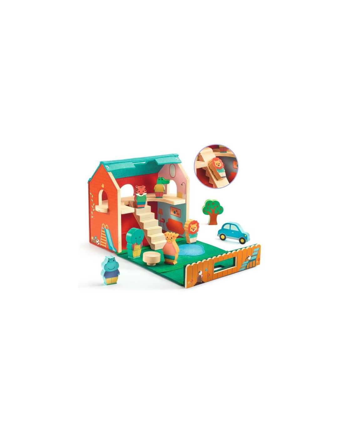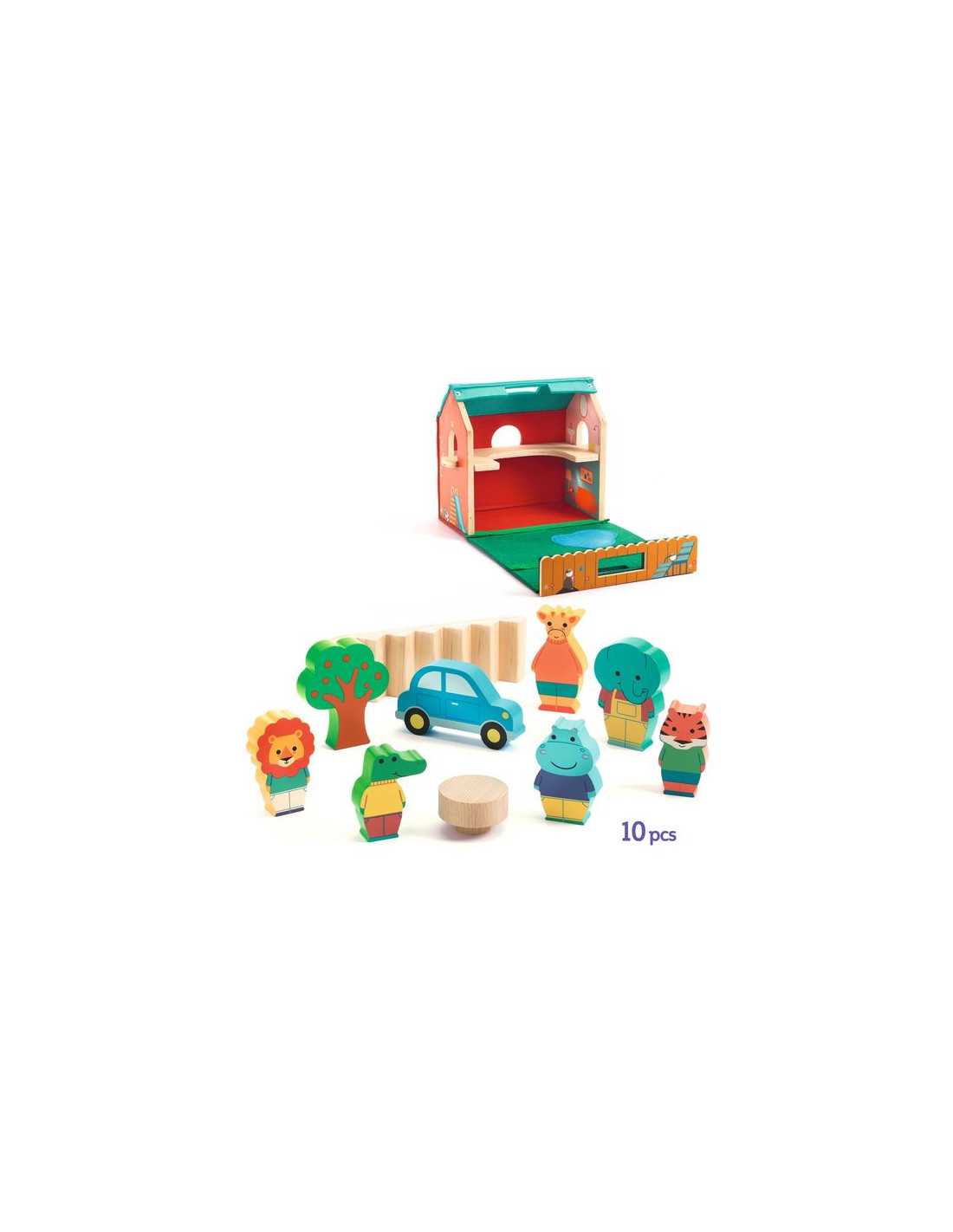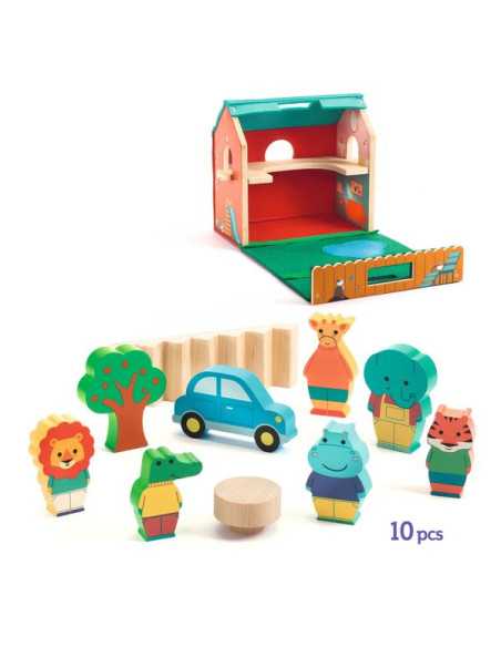 Le coffret comprend 1 maison en feutrine et bois et 10 éléments en bois : 1 tigre, 1 crocodile, 1 hippopotame, 1 éléphant, 1 girafe, 1 lion, 1 voiture, 1 table, 1 escalier/toboggan et 1 arbre.