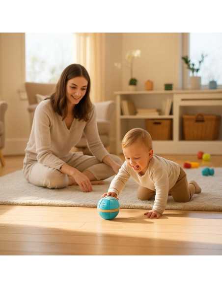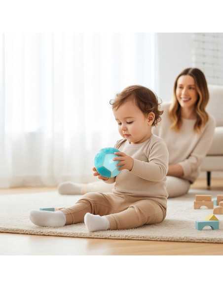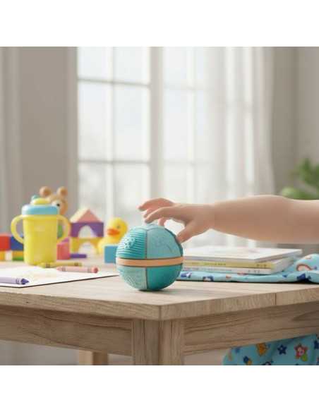 Sa taille de 9,5 cm est idéale pour les petites mains : facile à saisir, à lancer et à faire rouler, elle favorise le développement de la motricité fine, de la coordination et de la curiosité sensorielle.