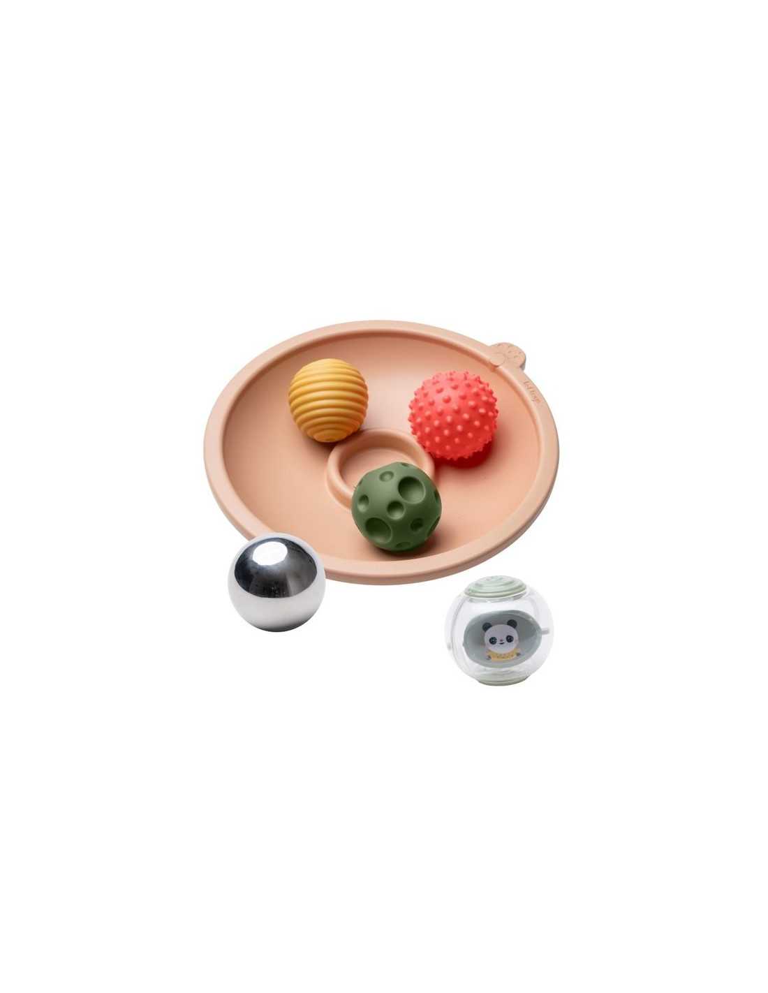 Une assiette avec 5 balles sensorielles et texturées pour stimuler les sens de bébé et lui permettre de jouer sur le ventre ou assis.