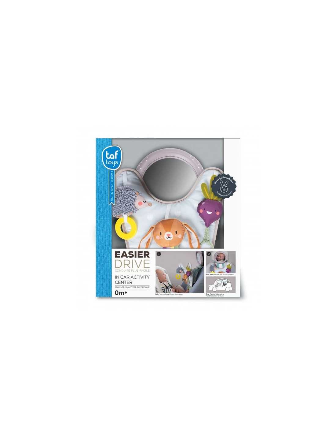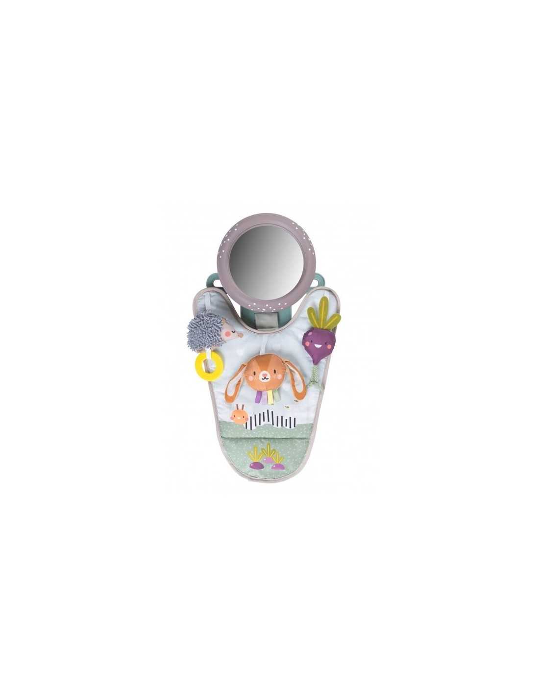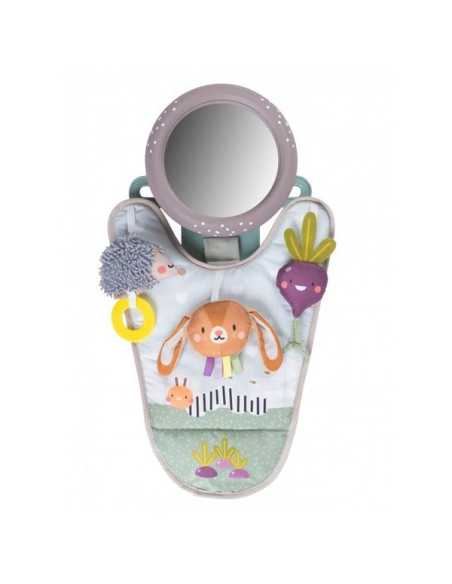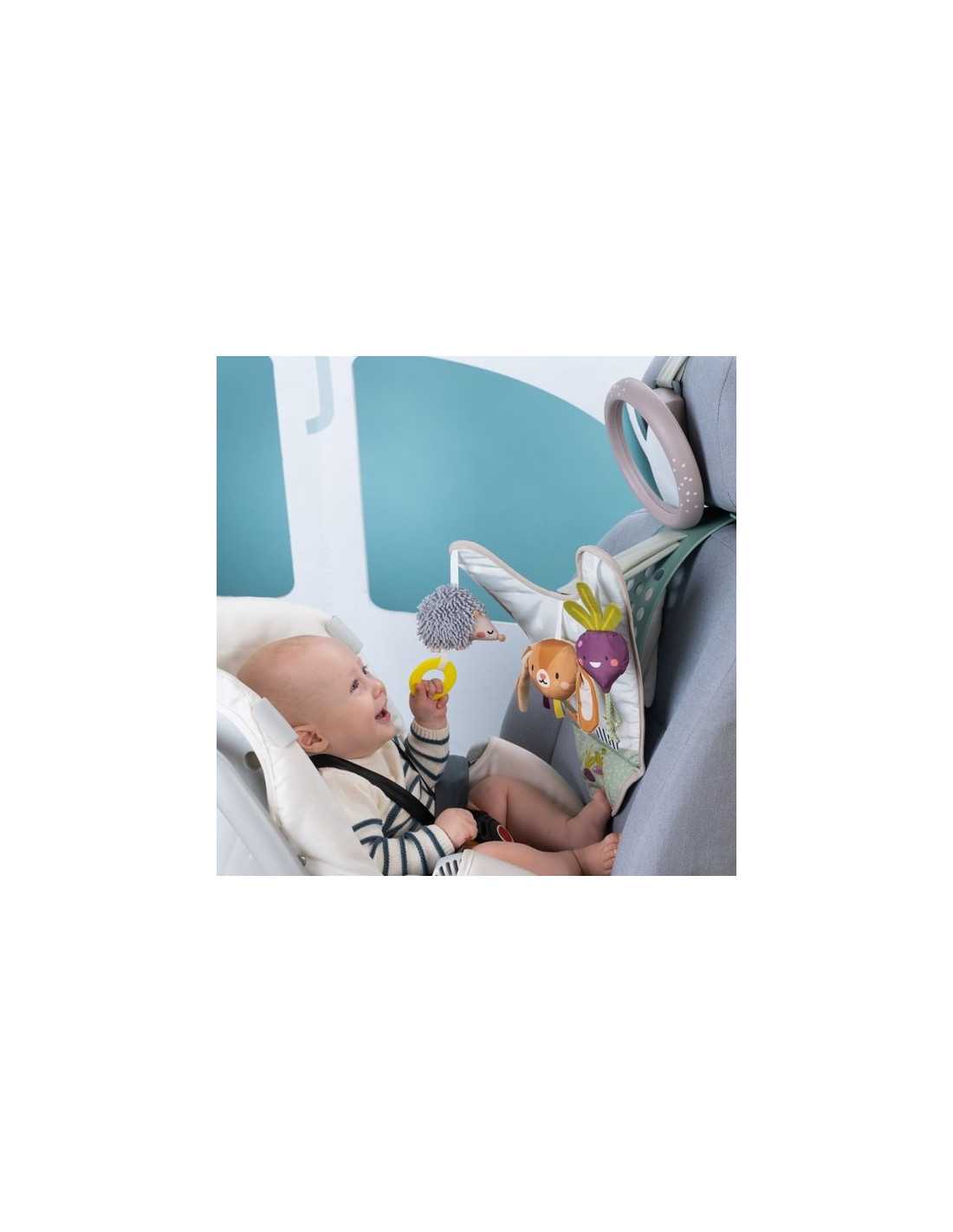 Le kit se compose d'un tableau d'activité et d'un miroir incurvé. Le miroir permet aux parents assis à l'avant de la voiture d'avoir un œil sur bébé. Ce jouet d'éveil comprend des activités variées: betterave bruissante, hérisson texturé avec anneau de dentition et lapin carillon.