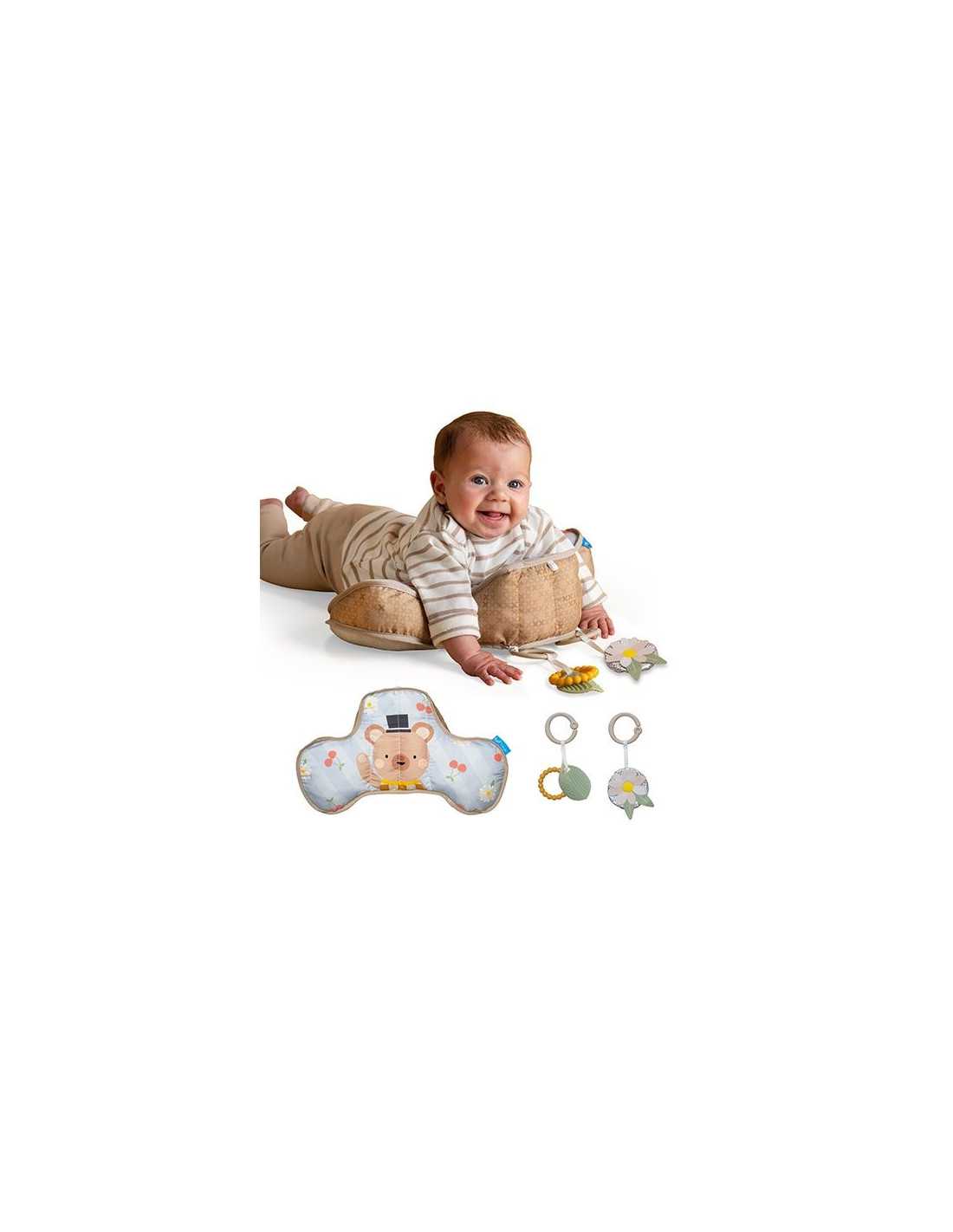 Un jouet Tummy Time qui comprend 1 coussin et 2 jouets amoviblese.