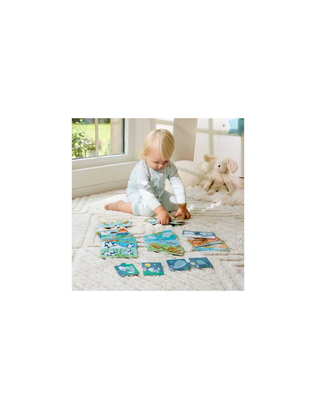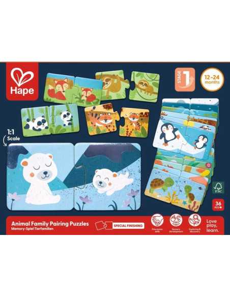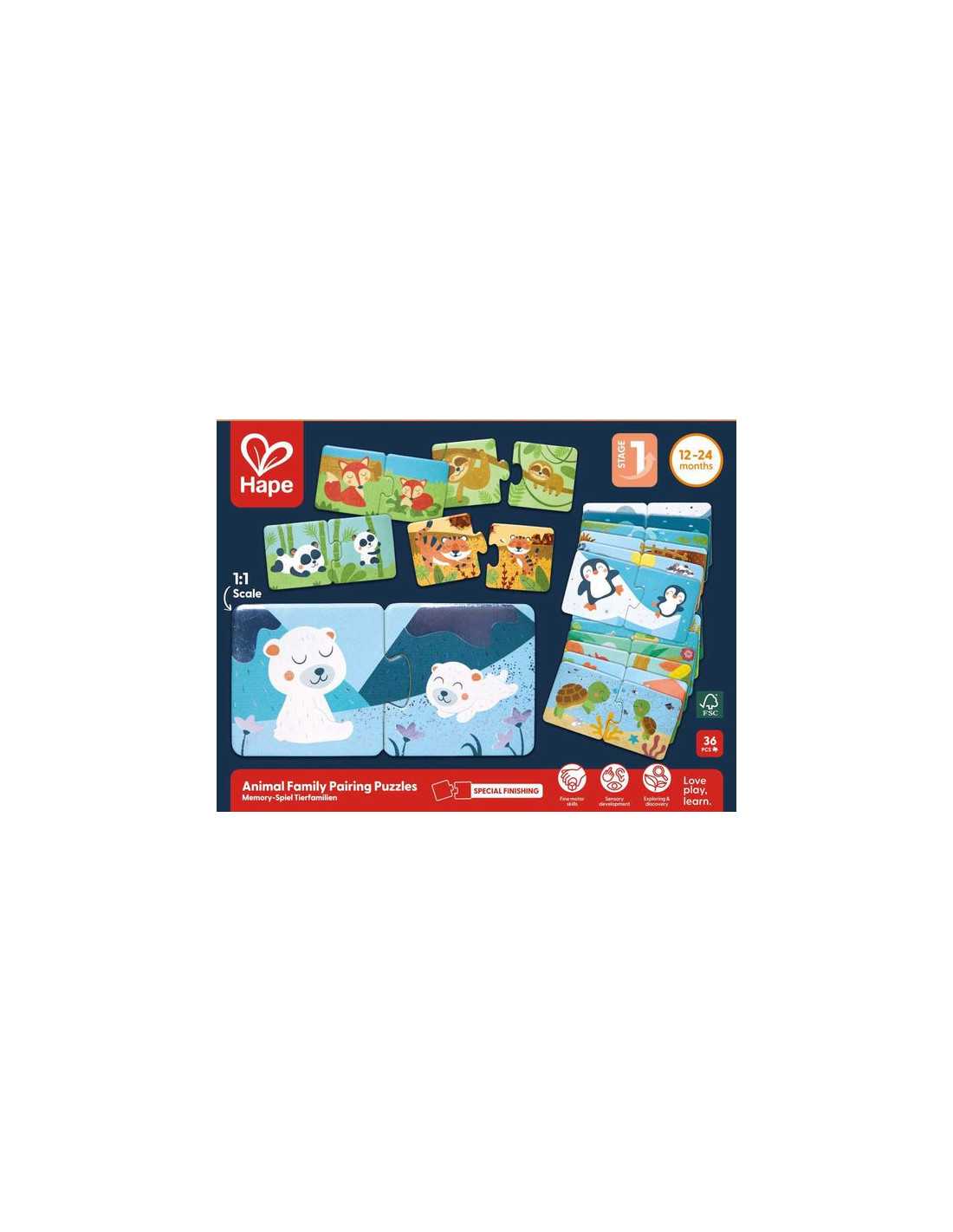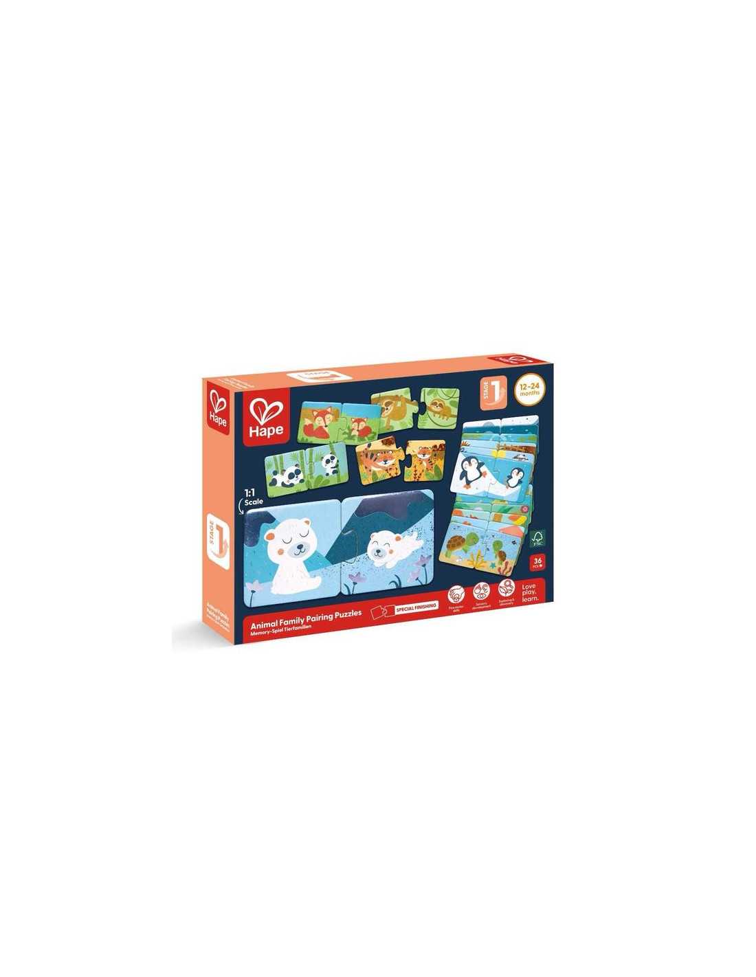 Découvrez les puzzles Famille d’animaux de Hape, un coffret comprenant 18 puzzles de 2 pièces, idéal pour les enfants de 12 à 24 mois.