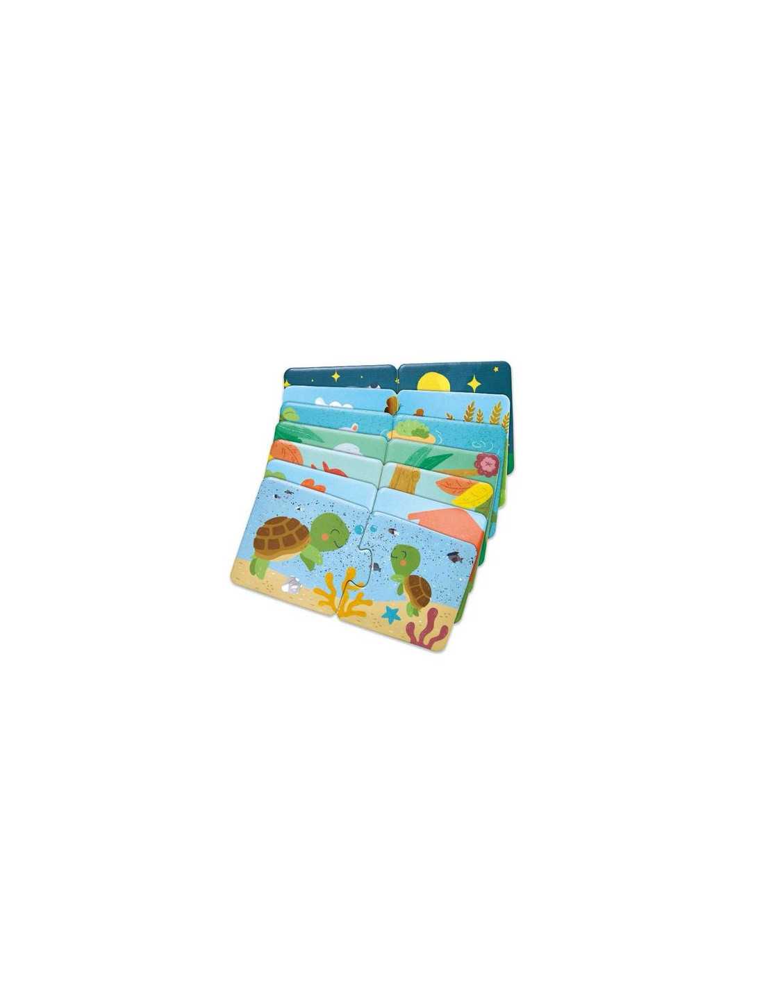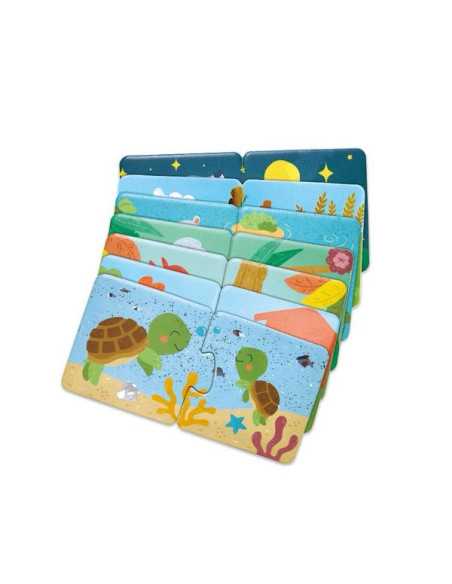 Le coffret contient 36 pièces de puzzle permettant de réaliser 18 puzzles représentant une tortue, un mouton, un cochon, un renard, un koala, un tigre, un panda...
