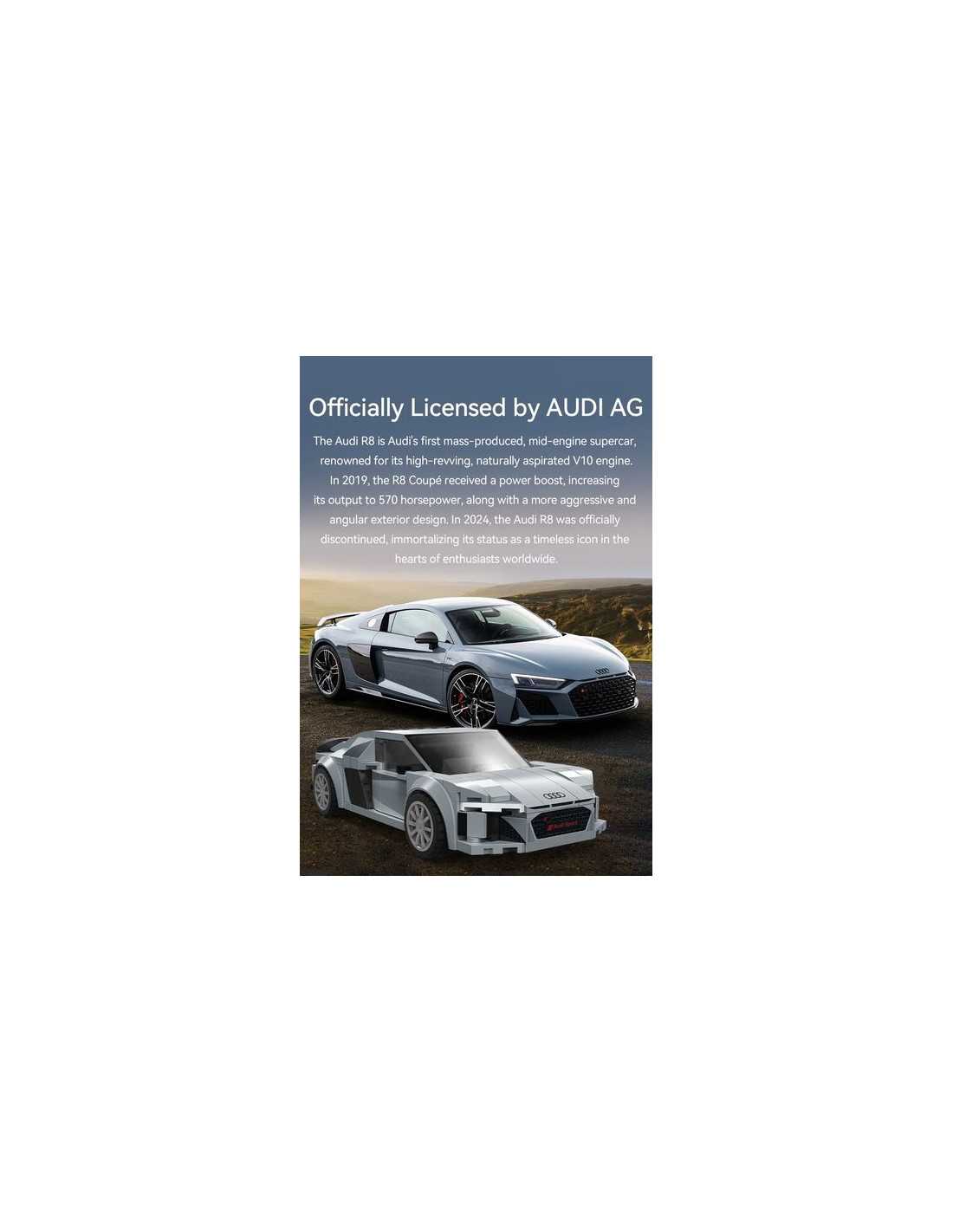 Une voiture à l'échelle 1:24 au design approuvé par Audi reproduisant le style agressif du coupé R8 de 2019 avec des lignes nettes, des doubles prises d'air et des calandres noires en maille. La carrosserie est entièrement imprimée pour des détails réalistes.