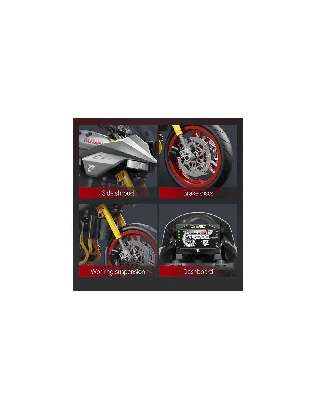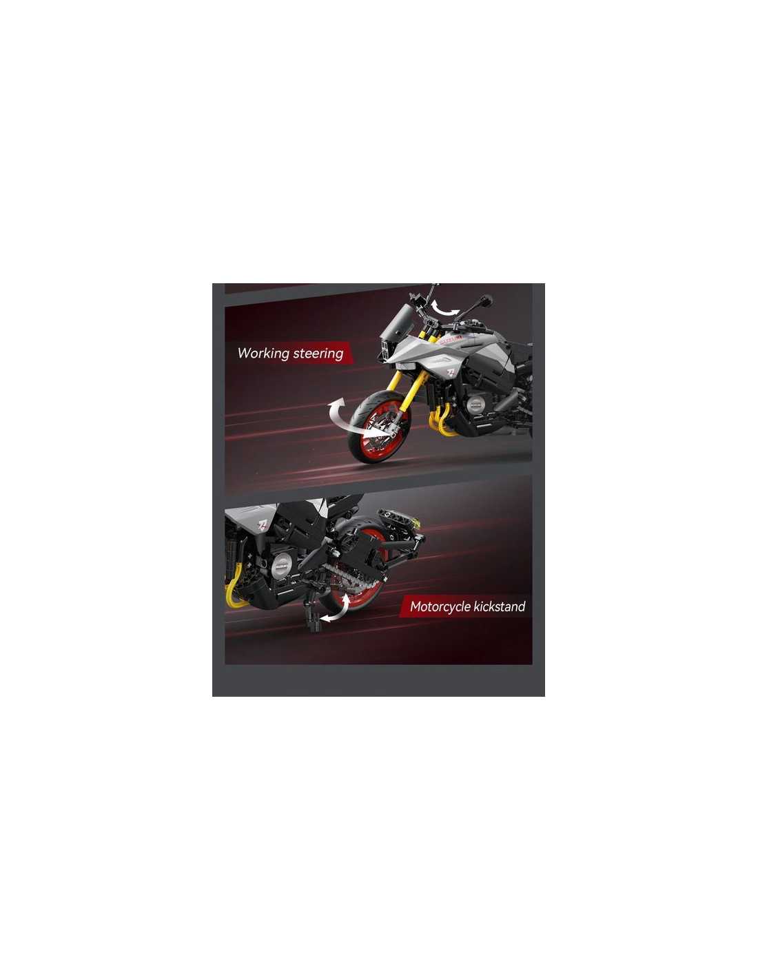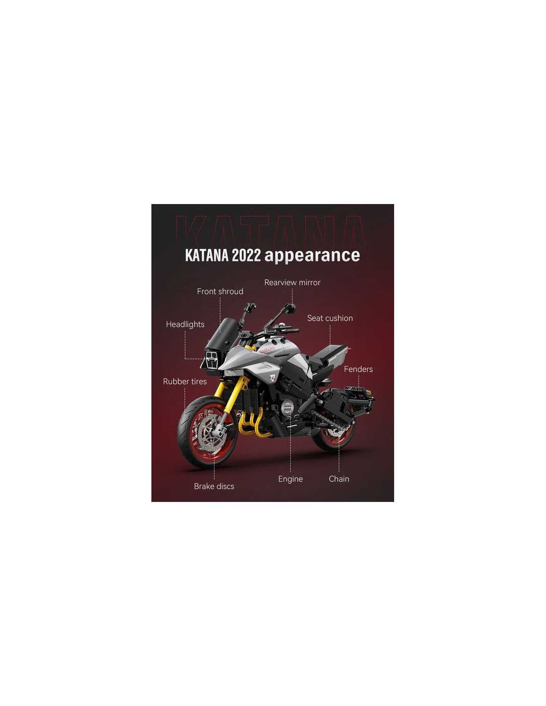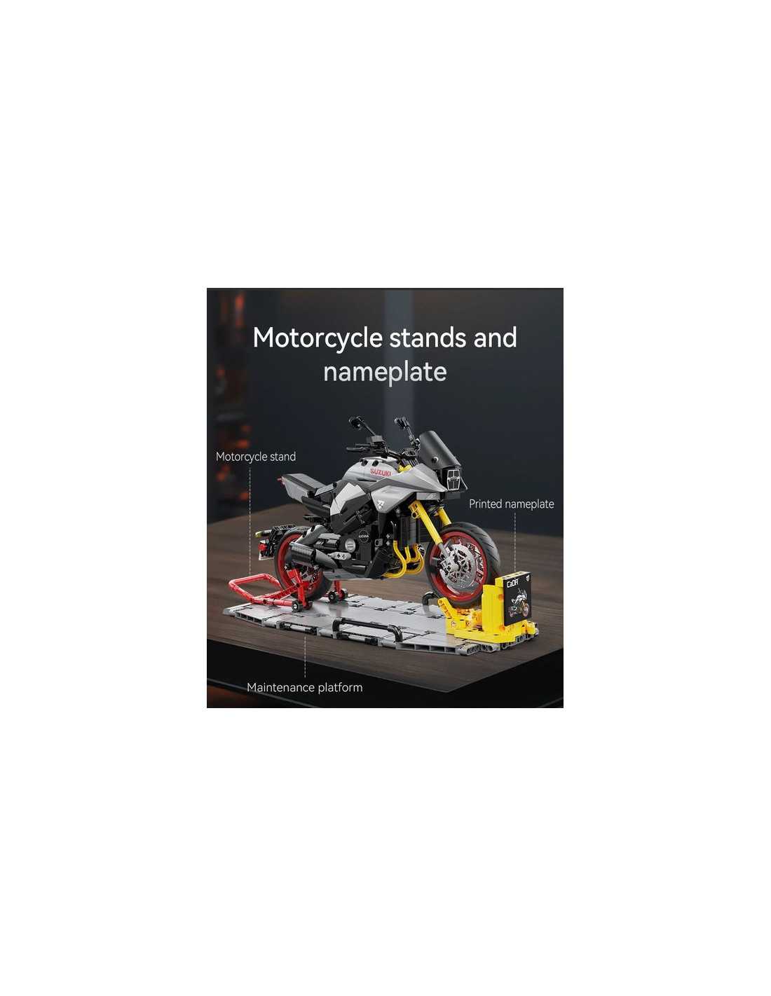 La moto Suzuki Katana est livrée avec deux ensembles de présentoirs et de plateformes d'entretien. Le moteur transparent relie les roues arrière pour restituer la structure réelle de la transmission mécanique ; la roue avant simule une direction à grande échelle, un contrôle souple et une excellente sensation de jeu.